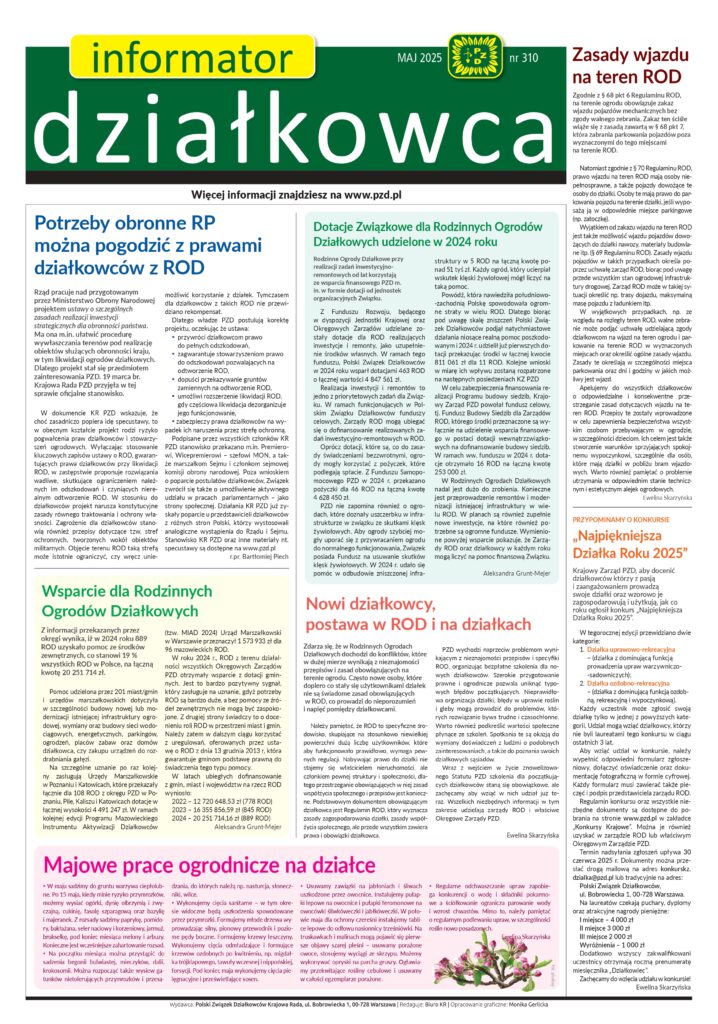 W najnowszym Informatorze „działkowca” m.in. o pracach Rządu nad przygotowanym przez Ministerstwo Obrony Narodowej projektem ustawy o szczególnych zasadach realizacji inwestycji strategicznych dla obronności państwa, dotacjach Związkowych dla ROD udzielonych w 2024 r., wsparciu dla ROD ze środków zewnętrznych, zasadach wjazdu na teren ROD, przestrzeganiu przepisów Regulaminu przez nowych działkowców, majowych pracach ogrodniczych oraz o konkursie „Najpiękniejsza Działka roku 2025”.