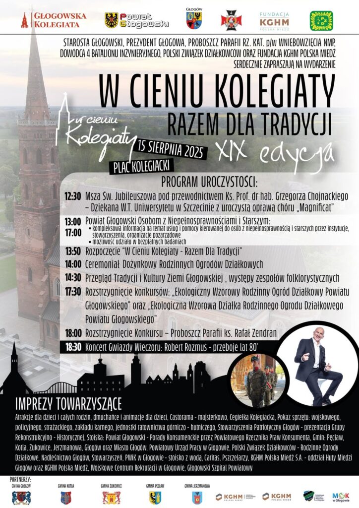 XIX edycja wydarzenia „W Cieniu Kolegiaty – Razem dla Tradycji”, które odbędzie się 15 sierpnia 2025 roku na Placu Kolegiackim w Głogowie.
