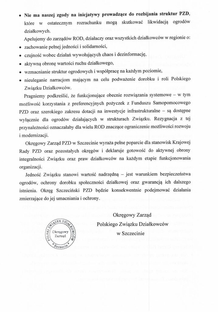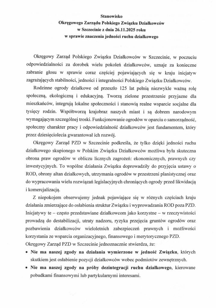 Stanowisko Okręgowego Zarzadu Polskiego Związku Działkowców w Szczecinie z dnia 26.11.2025 r.