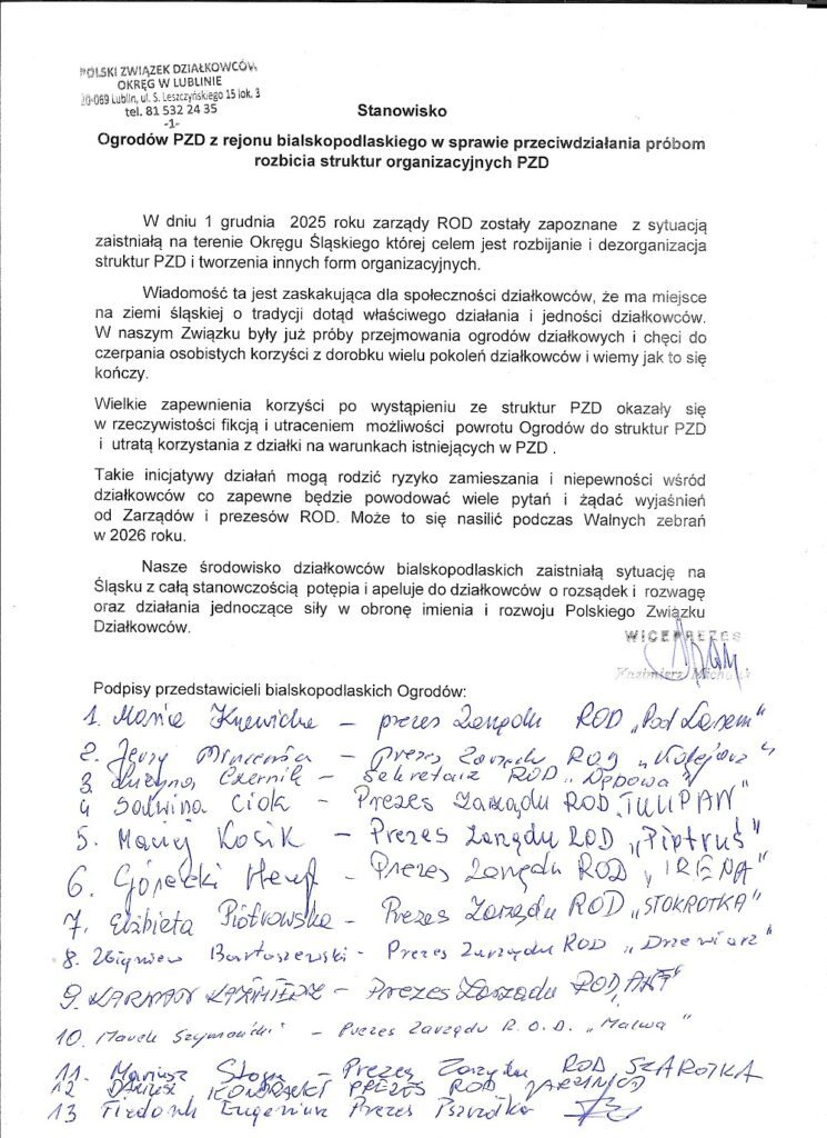 Stanowisko Ogrodów PZD z rejonu bielskopodlaskiego w sprawie przeciwdziałania próbom rozbicia struktur organizacyjnych PZD – 03.12.2025r.