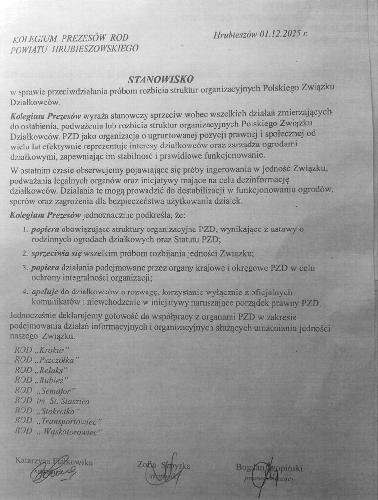 Stanowisko Kolegium prezesów ROD powiatu Hrubieszowskiego w sprawie przeciwdziałania próbom rozbicia struktur organizacyjnych PZD – 04.12.2025r.