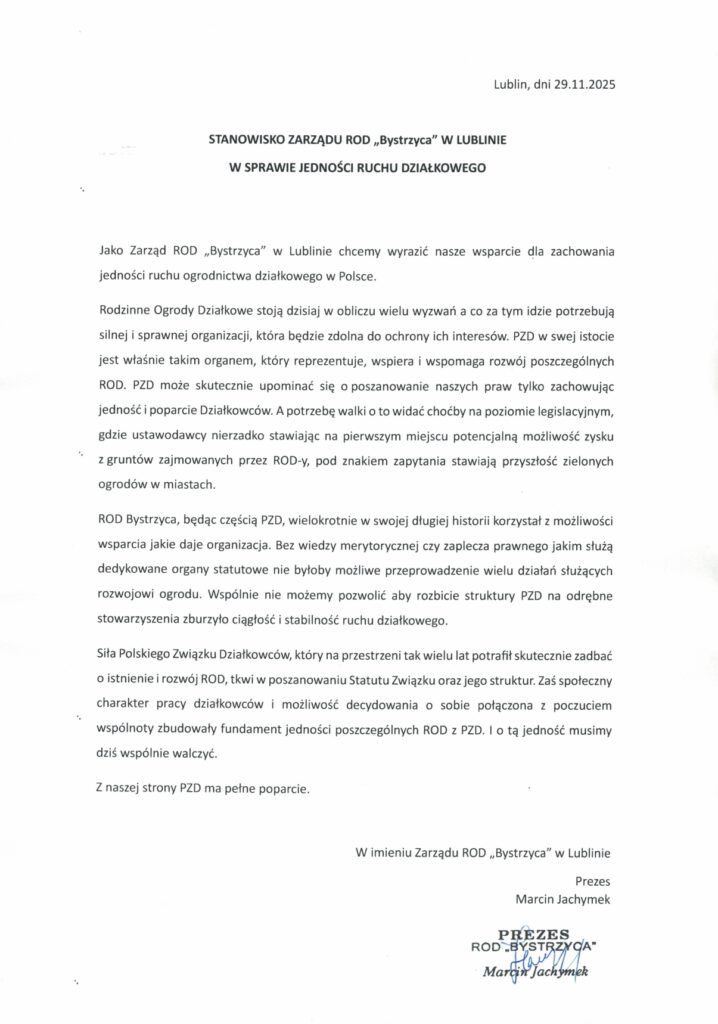 Stanowisko Zarządu ROD „Bystrzyca” w Lublinie w sprawie jedności ruchu działkowego – 03.12.2025r.