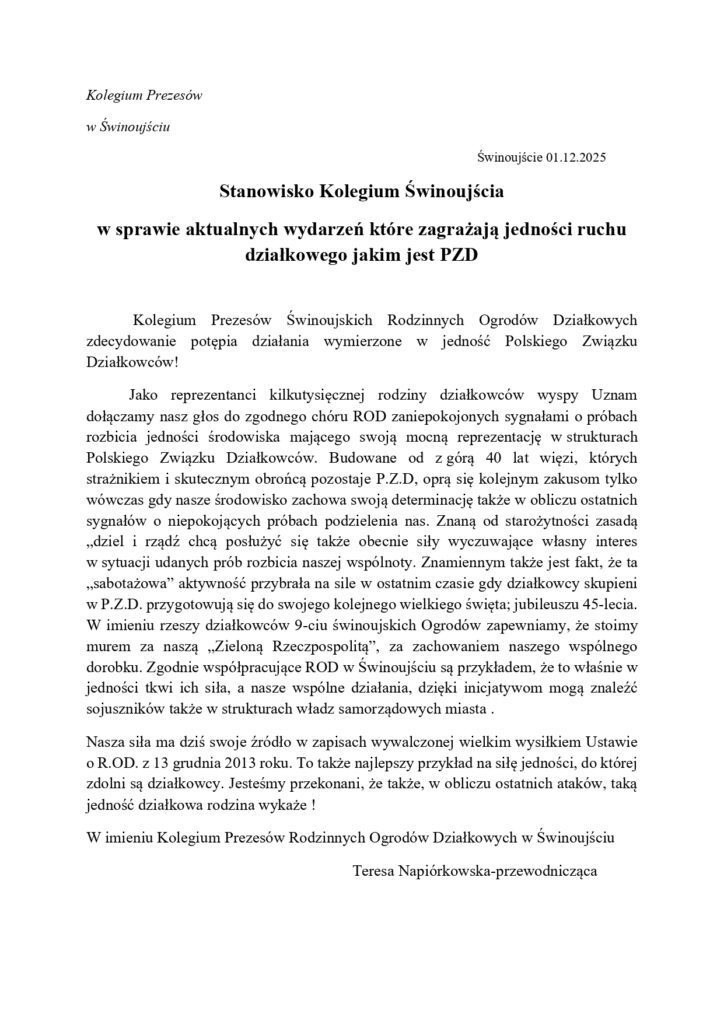 Stanowisko Kolegium Świnoujścia w sprawie aktualnych wydarzeń które zagrażają jedności ruchu działkowego jakim jest PZD – 04.12.2025r.