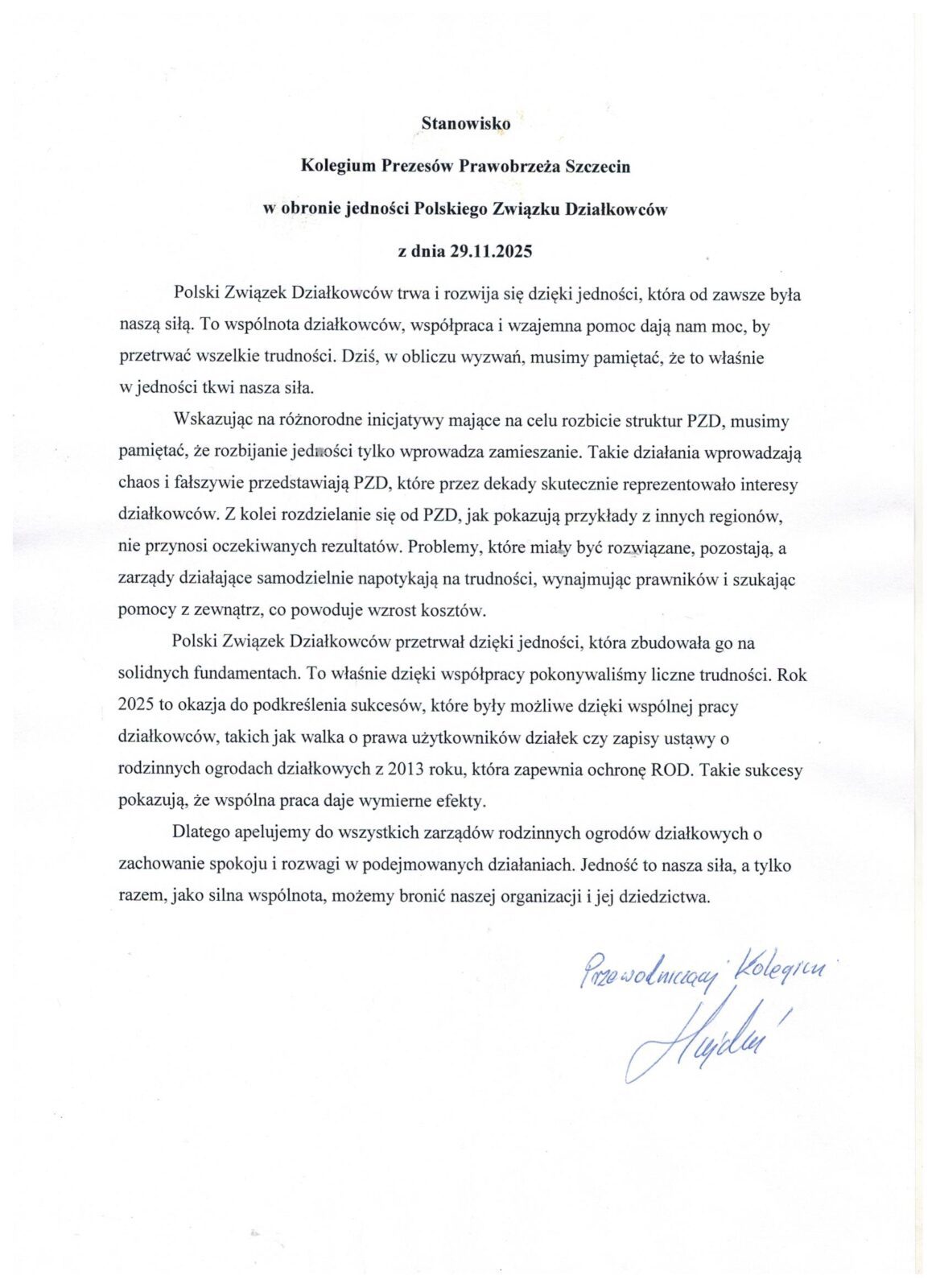 Stanowisko Kolegium Prezesów Prawobrzeża Szczecin w obronie jedności Polskiego Związku Działkowców z dnia 29.11.2025 r. – 08.12.2025