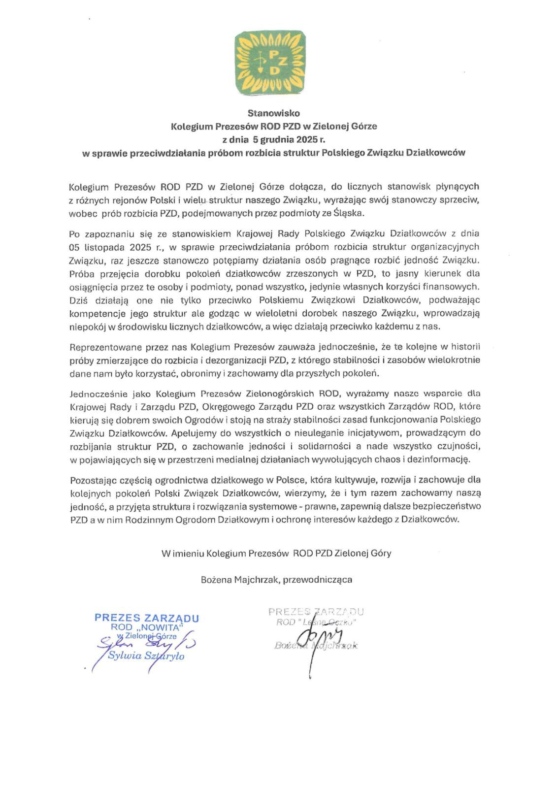 Stanowisko Kolegium Prezesów ROD PZD w Zielonej Górze z dnia 5 grudnia 2025 r. w sprawie przeciwdziałania próbom rozbicia struktur Polskiego Związku Działkowców – 08.12.2025