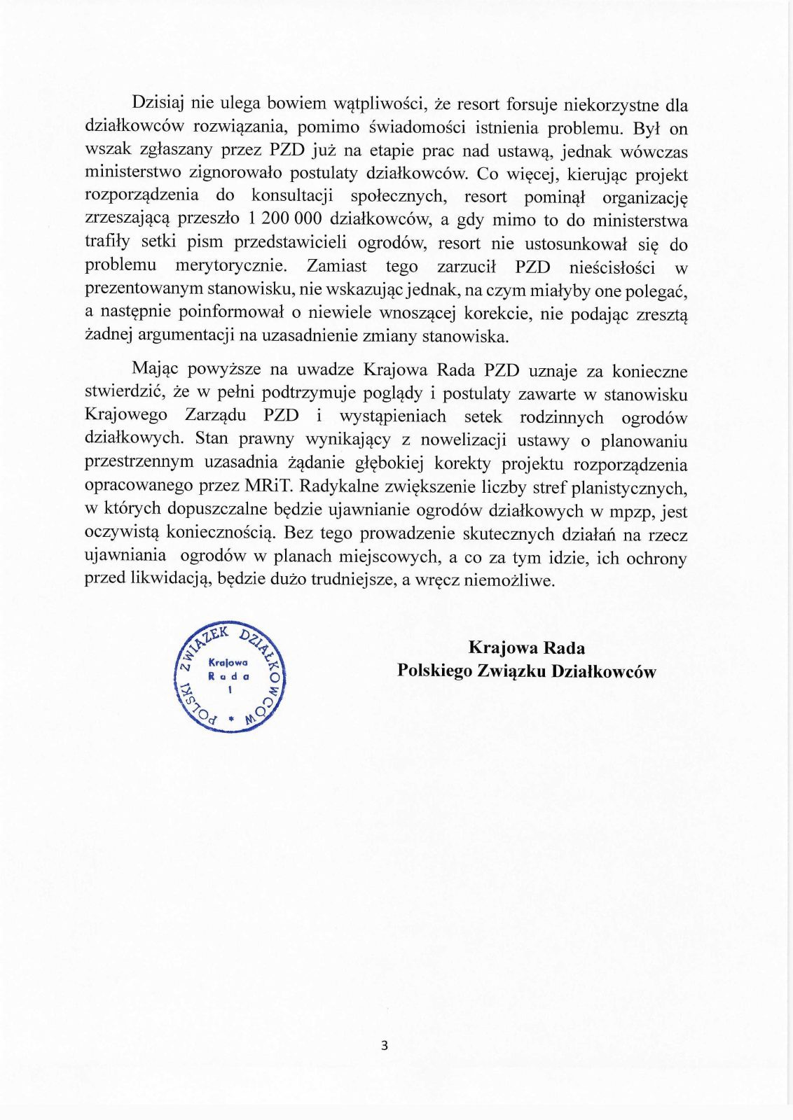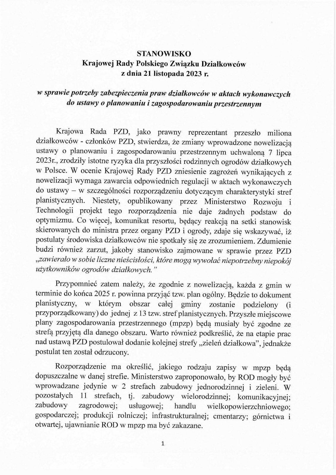 Krajowa Rada PZD, jako prawny reprezentant przeszło miliona działkowców – członków PZD, stwierdza, że zmiany wprowadzone nowelizacją ustawy o planowaniu i zagospodarowaniu przestrzennym uchwaloną 7 lipca 2023r., zrodziły istotne ryzyka dla przyszłości rodzinnych ogrodów działkowych w Polsce. W ocenie Krajowej Rady PZD zniesienie zagrożeń wynikających z nowelizacji wymaga zawarcia odpowiednich regulacji w aktach wykonawczych do ustawy – w szczególności rozporządzeniu dotyczącym charakterystyki stref planistycznych. Niestety, opublikowany przez Ministerstwo Rozwoju i Technologii projekt tego rozporządzenia nie daje żadnych podstaw do optymizmu.